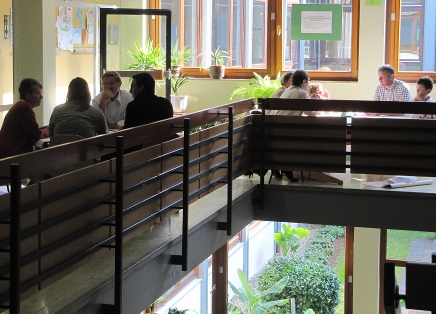 am Lichthof einer Schule. In überschaubaren Arbeitsgruppen finden wesentliche Gespräche Raum, um die Ideen zur