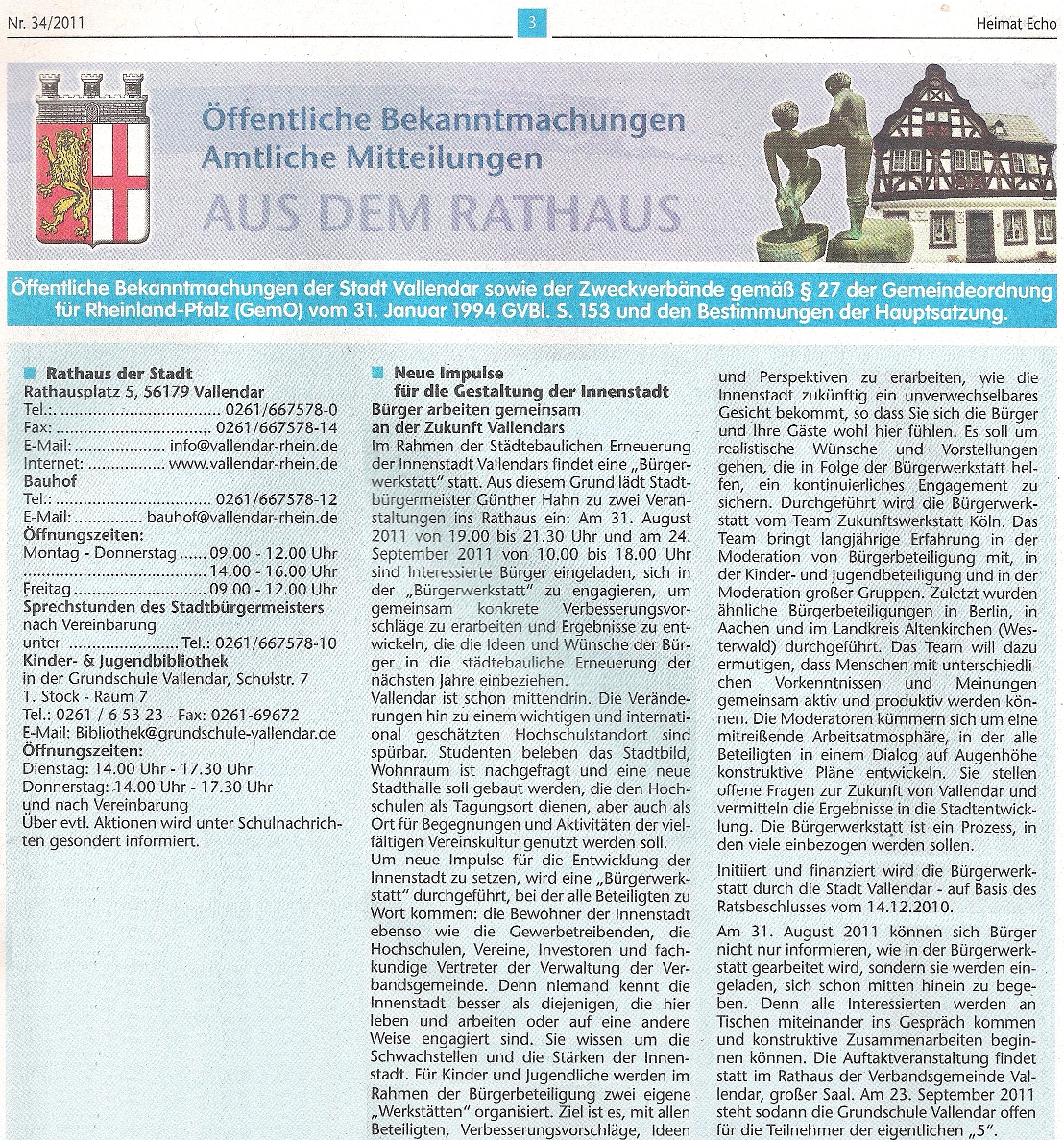 und in den amtlichen Mitteilungen aus dem Rathaus der Stadt Vallendar in den beiden Zeitungen