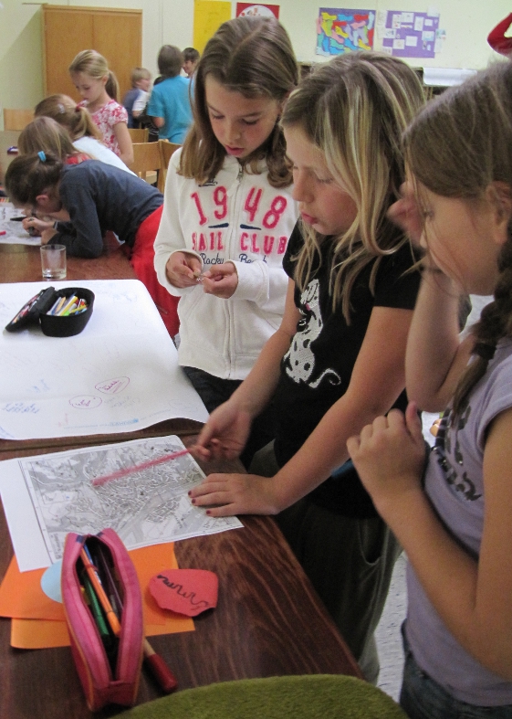 Nach der Stadtralley zurück in der Schule, entwerfen die Schulkinder anhand von Stadtplänen, aber auch mit allerlei